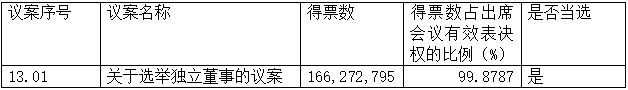 本次股東大會審議的議案十三采用累積投票制,此議案的表決結(jié)果僅統(tǒng)計列示表決同意股數(shù)及比例。