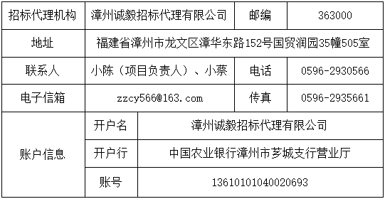 地點:漳州誠毅招標代理有限公司(福建省漳州市龍文區漳華東路152號國貿潤園35幢505室)