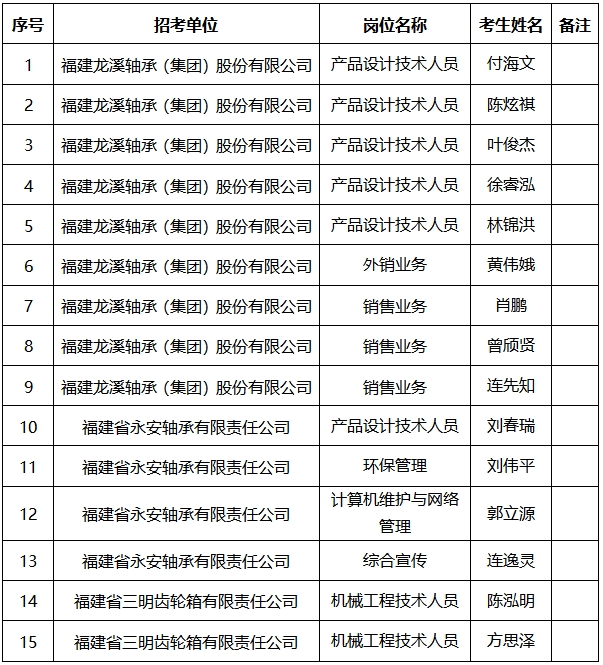 根據《福建龍溪軸承(集團)股份有限公司2024年公開招聘公告》有關規定,經筆試、面試等程序,現將集團本部及權屬企業(福建省永安軸承有限責任公司、福建省三明齒輪箱有限責任公司)擬聘用人員予以公示,公示期為5個工作日,公示名單如下: