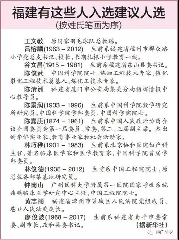 ????在前期的遴選推薦、群眾網(wǎng)上投票、組委會(huì)集中審議、中央和國家機(jī)關(guān)有關(guān)部門認(rèn)真審核下,組委會(huì)于9月15日公示了300名“最美奮斗者”建議人選名單。其中,“時(shí)代楷模”、全國公安系統(tǒng)一級(jí)英模、廈門市公安局民警陳清洲和漳州市薌城區(qū)人民法院黨組成員、巷口人民法庭庭長黃志麗榜上有名。同時(shí),福建共有12人入選建議人選名單。