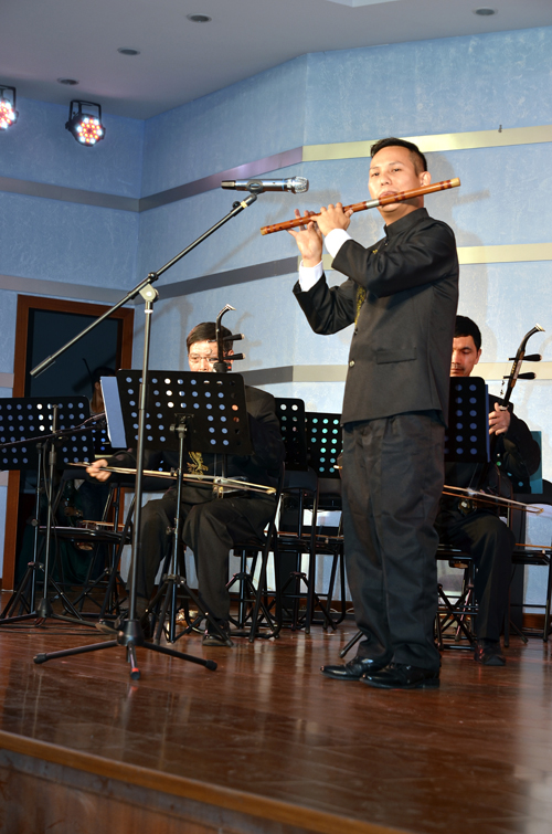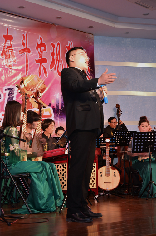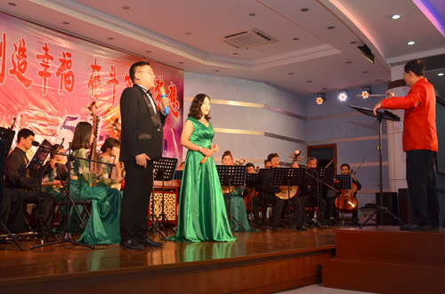 當(dāng)晚,公司俱樂部燈光璀璨,樂聲歡騰。隨著強(qiáng)勁的鼓點(diǎn)響起,開場舞《騰龍鼓樂》拉開了整場晚會的序幕,隨后,公司“老”歌手曾艷輝及團(tuán)委組建的舞蹈隊(duì)帶來了精彩的歌伴舞《雙腳踏上幸福路》,“新”歌手張錚聲情并茂地演繹了歌劇《江姐》選段《我為共產(chǎn)主義把青春貢獻(xiàn)》及民歌《桃花紅杏花白》,龍通藝術(shù)團(tuán)的歌手李紅英、吳罕帶來的獨(dú)唱《好日子》、《我愛你中國》喜慶激昂,羅斌峰的笛子獨(dú)奏《牧民新歌》及樂團(tuán)現(xiàn)場演奏的《龍江歡歌》、《紅樓夢插曲》、《蘇南小調(diào)》余音繞梁,男歌手熊凱、溫?zé)ㄕ竦哪新暘?dú)唱《格桑梅朵》、《懷念戰(zhàn)友》、《駿馬奔馳保邊疆》、中央民族大學(xué)聲樂碩士郭源源為大家?guī)淼摹逗oL(fēng)陣陣》、《一杯美酒》大氣悠揚(yáng)。