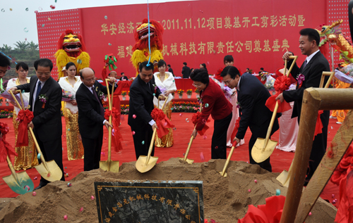 2011年11月12日,在第三屆海峽兩岸現(xiàn)代農(nóng)業(yè)博覽會(huì)·第十三屆海峽兩岸花卉博覽會(huì)即將召開(kāi)之際,公司全資子公司——福建金昌龍機(jī)械科技有限責(zé)任公司在漳州市華安經(jīng)濟(jì)開(kāi)發(fā)區(qū)舉行了盛大的奠基典禮!漳州市市長(zhǎng)吳洪芹及洪仕建、陳少青等市領(lǐng)導(dǎo)親臨慶典現(xiàn)場(chǎng)并為項(xiàng)目揭彩、培土,華安縣委書(shū)記柯志宏、縣長(zhǎng)沈建平率華安縣相關(guān)部門(mén)負(fù)責(zé)人,公司黨委書(shū)記、董事長(zhǎng)曾凡沛、總經(jīng)理許廈生、常務(wù)副總經(jīng)理陳晉輝率全體中層主管參加了奠基典禮。公司黨委書(shū)記、董事長(zhǎng)曾凡沛在慶典上發(fā)表了熱情洋溢的致辭